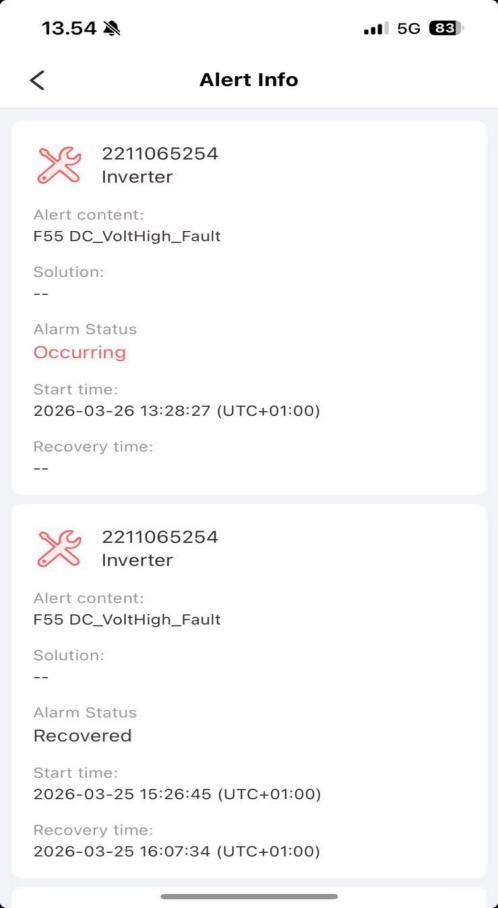 - Radix causae: chorda PV1 modulorum nimis multos continet in serie, ut ambitus intentionis apertae signanter invertentem excedat. ' s MPPT vel DC initus fines. Screenshot ostendit 799,90 V quod fines proprios longe excedit.