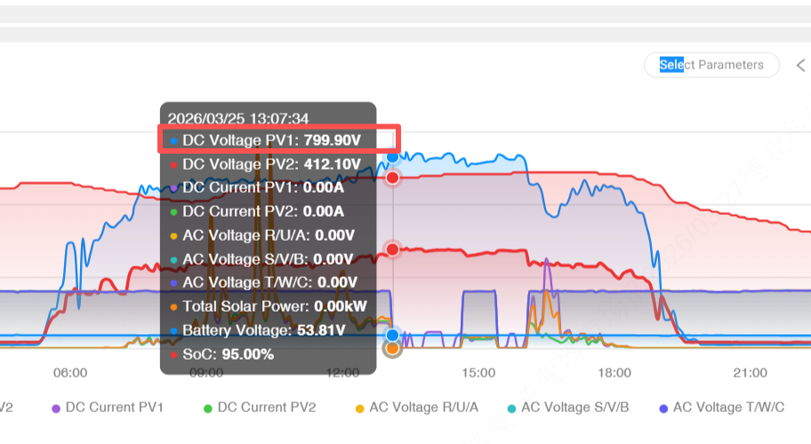 Casus hic typicus est: series chordae PV1 computatio nimis alta est ut ambitus rotundus 799.90 V attingit, invertentem longe excedens. ' s licita input. Sub irradiatione fortis, overvoltage praesidio necessario utitur. Nonnulli etiam casus disparitatem inter PV1 et PV2 in moduli speciei vel chordae enumeratione demonstrant, causando unum chordum ad excedentem intentionem tutandam.